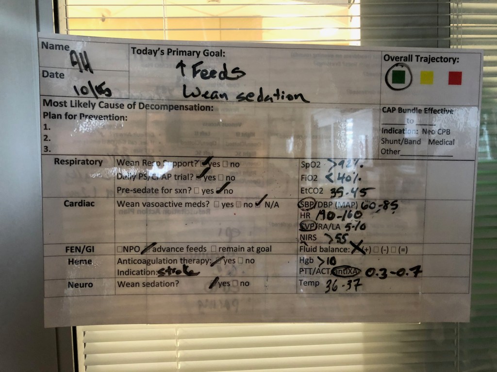 To pour lemon juice on the cut, we technically don’t have to be in the ICU anymore. In the ICU, they have a chart for each patient with a heading “Overall trajectory.” You hold your breath the entire time your child is the red. Audrey spent the last few weeks in yellow. This week, her chart shows green for the first time in her life. I think green might be my new favorite color. And do you see anything missing in the picture? That’s right. My little girl is breathing on her own now.