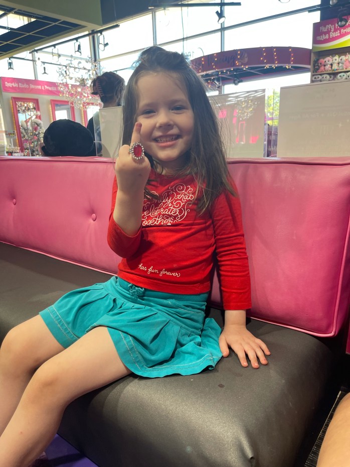 It takes a village to corrupt a child. Since we don’t do anything halfway in our house, I brought in a professional, Aunt Amy. We let Ella enjoy a day at Camp Evans where Aunt Amy took her to get her first mani/pedi. She was so proud of her nails and new toy ring, that she proudly displayed them to the world.